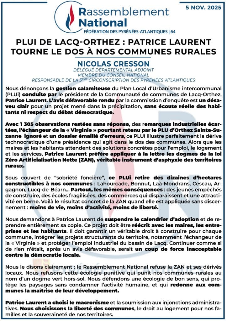 Avec 1 305 observations restées sans réponse, des remarques industrielles écartées, l’échangeur de la « Virginie » pourtant retenu par le PLU d’Orthez Sainte-Suzanne ignoré et un dossier émaillé d’erreurs, ce PLUi illustre parfaitement la dérive technocratique d’une présidence qui agit dans le dos des communes. Alors que les maires et les habitants attendent des solutions concrètes pour l’emploi, le logement et les services, Patrice Laurent préfère appliquer à la lettre les dogmes de la loi Zéro Artificialisation Nette (ZAN), véritable instrument d’asphyxie des territoires ruraux.